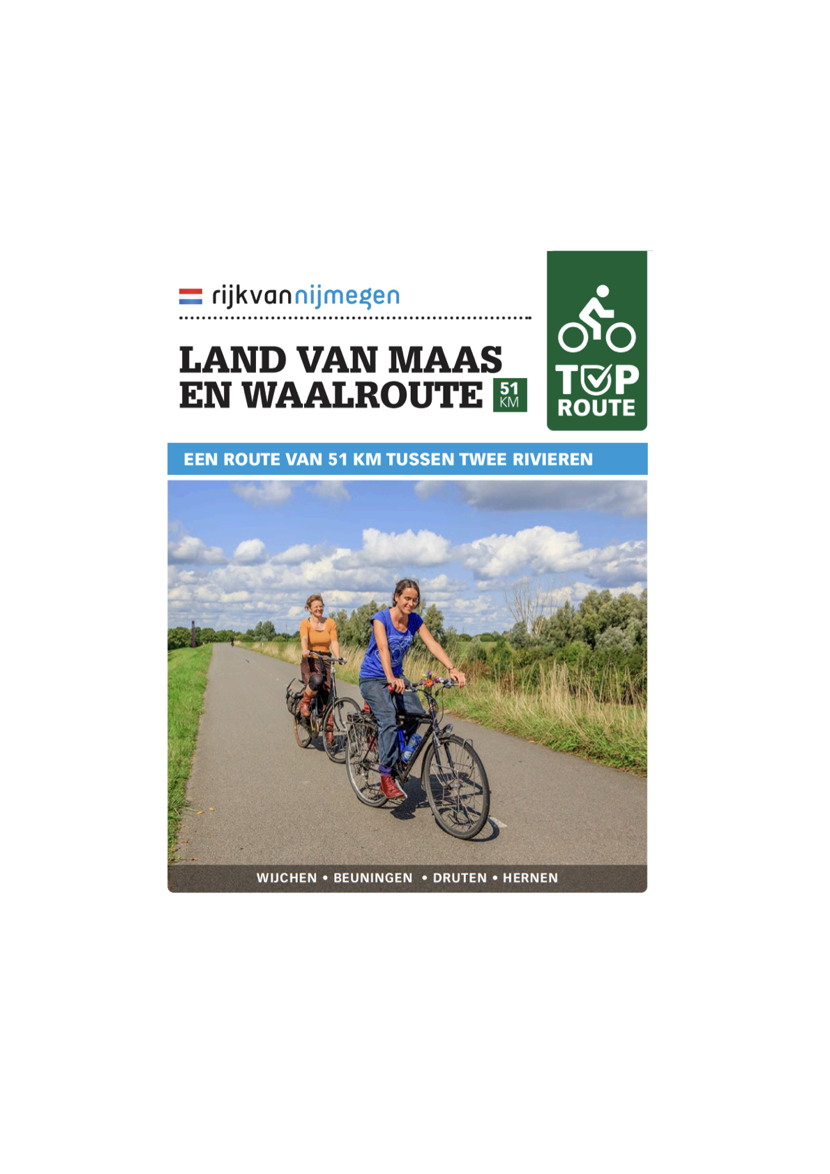Fietsen tussen twee rivieren Deze route gaat door Wijchen, Beuningen, Druten en Hernen en langs kastelen, over dijken en over het platteland. Een fietstocht door het zeer afwisselende landschap tussen Maas en Waal.